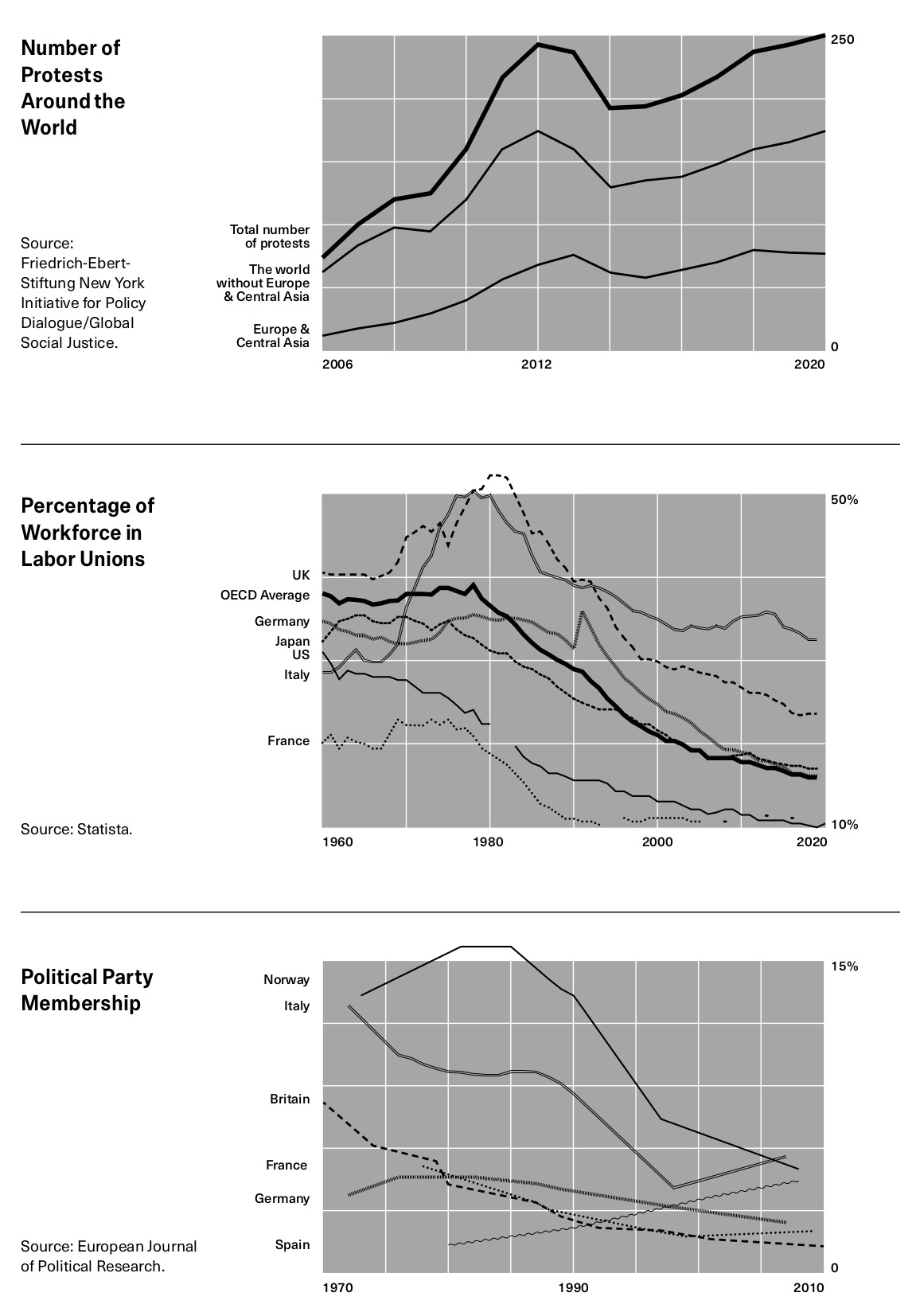 Leaving aside some minor exceptions, the graphs in question display a world increasingly subject to protest and polarization. Yet it also is a world not taken with the modes of durable, patient collective action recurrent throughout the late-nineteenth and twentieth century. While protest activity increased across the 2010s and 2020s, and online media were swamped with political commentary, party membership, unionization, and strike frequency continued their age-old, stubborn decline. Indeed, the two curves seem to share a negative correlation, with the mood of protest coinciding with a continued fall in civic engagement.